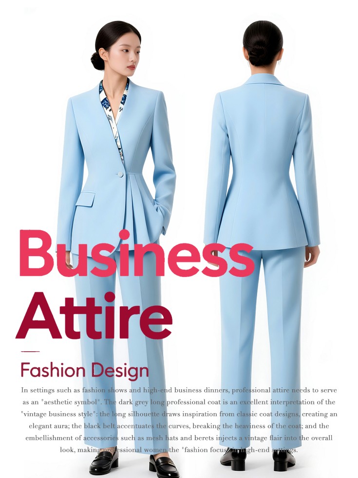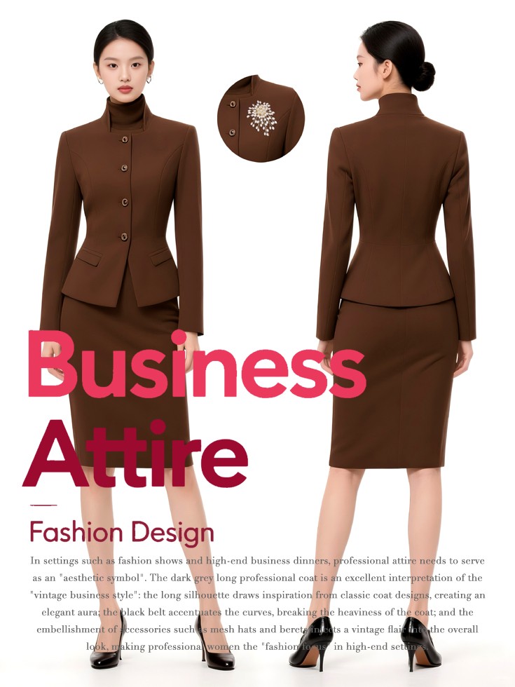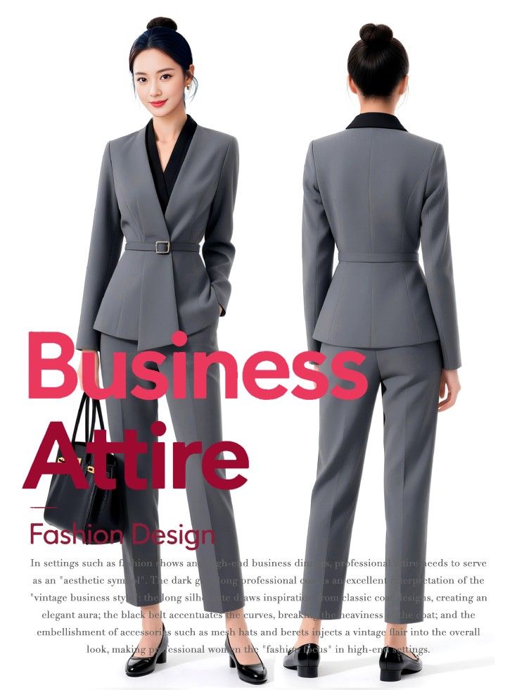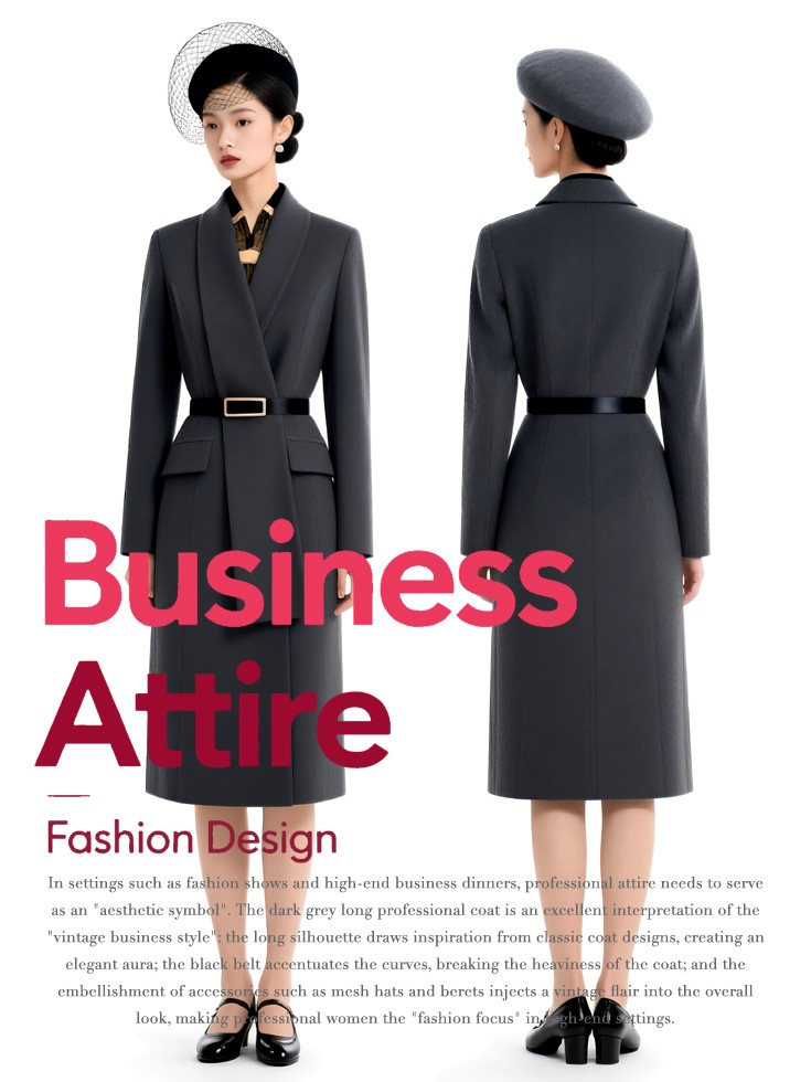 在时尚发布会、高端商务晚宴等场景,职业装需承载“审美符号”的功能。深灰色长款职业大衣是“复古商务风”的绝佳诠释:长款廓形借鉴经典大衣设计,营造优雅气场;黑色腰带勾勒曲线,打破大衣的厚重感;网纱礼帽、贝雷帽等配饰的点缀,为整体注入复古风情,让职场女性在高端场合中成为“时尚焦点”。面料选择垂坠感强的厚重材质,同时通过配饰的可替换性,实现“一衣多风格”的定制价值。