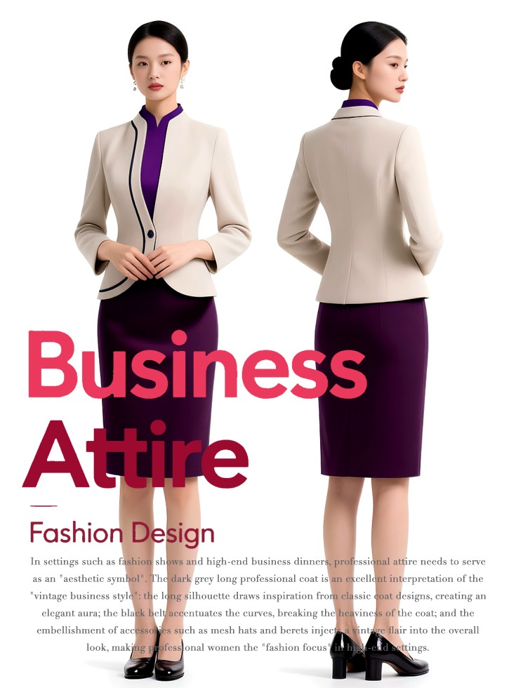 高端服务行业(如政企会议、高端会所)的礼仪着装,需在标准化中传递温度。浅米色西装与深紫色裙装的组合,以撞色美学打破刻板:浅米色西装采用立体剪裁,黑色饰边强化轮廓感;深紫色裙装与内搭形成色彩呼应,柔化职业装的冷硬。面料选择挺括抗皱的混纺材质,既保障长期穿着的版型稳定,又通过“米紫碰撞”的色彩心理学,传递“专业且亲和”的服务形象,成为高端服务场景的视觉名片。