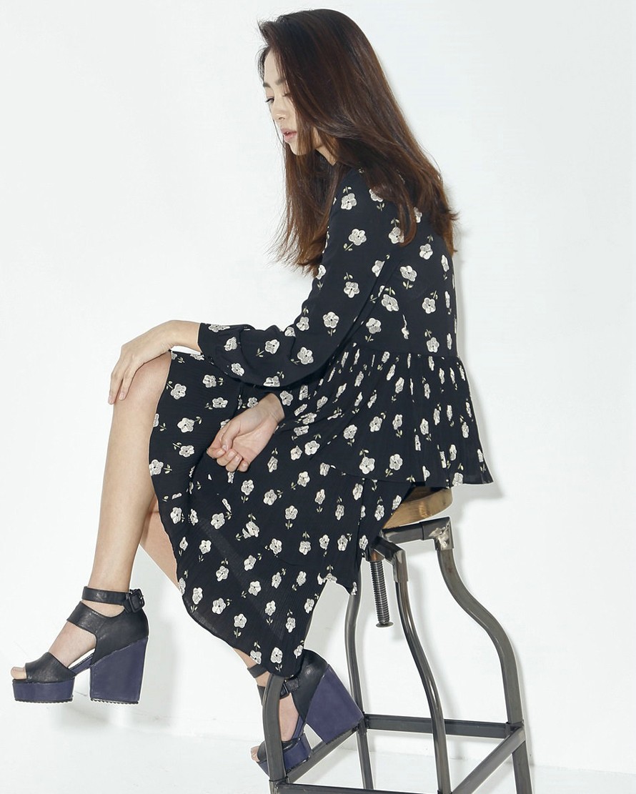 墨绿色连衣裙显得美腿修长,粉色风衣外套透出优雅气质,百变造型随心驾驭。