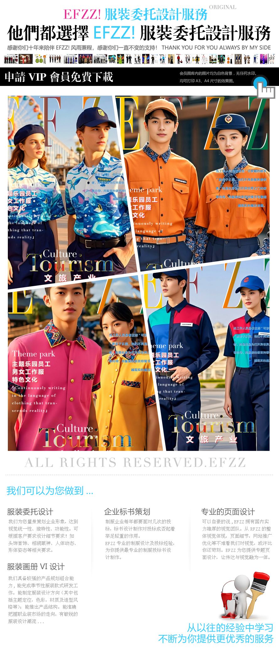 国内民族特色景区游乐场夏季员工工作服定制方案 当文旅产业进入深度体验时代,景区员工不再只是服务的提供者,更是民族文化的传递者、景区IP的行走名片。本方案专为国内民族特色景区、主题游乐场量身打造,以「文化为魂、舒适为底、颜值为翼」,将民族文化基因融入夏季工装设计,让每一位员工都成为行走的文化符号,让服务自带文化温度。 一、设计理念:文化与实用的双向奔赴 本方案深度挖掘各民族服饰的文化精髓,提取传统纹样、色彩、剪裁等核心元素,结合夏季户外工作的场景需求,打造「可穿、好看、有文化」的工装体系。 文化赋能:从苗绣、藏纹、壮锦、敦煌壁画等民族文化符号中提取设计灵感,将传统元素以现代剪裁重构,既保留文化辨识度,又符合当代审美,让员工着装成为景区文化的「活招牌」,强化游客的沉浸式文化体验。 舒适适配:针对夏季高温、户外作业的场景,选用透气、速干、抗皱、防晒的高功能面料,兼顾长短袖、不同版型的设计,满足不同岗位(售票、运维、客服、演艺)的工作需求,让员工在高温环境下保持清爽舒适,提升服务效率。 颜值升级:打破传统工装的刻板印象,打造兼具时尚感与辨识度的设计,适配景区拍照打卡的传播属性,让员工穿搭成为景区的流动风景线,助力景区内容传播与品牌升级。 二、方案亮点:四大核心优势,适配全场景需求 全岗位适配:覆盖景区全岗位需求,从一线服务岗到运维岗,从长袖防晒款到短袖清凉款,提供差异化设计,兼顾美观与实用性。 文化可定制化:可根据景区的民族特色、地域文化、IP主题,定制专属纹样、色彩与标识,打造独一无二的景区工装体系,强化品牌记忆点。 夏季功能拉满:精选高透气、高防晒、速干抗皱的夏季专用面料,搭配合理的剪裁设计,解决夏季工装闷热、不透气、易变形的痛点。 传播属性拉满:高颜值设计适配景区拍照打卡,助力员工穿搭成为景区社交传播素材,提升景区曝光度与品牌影响力。 三、价值赋能:不止于工装,更是文旅融合的新载体 本方案不止是一套工作服,更是景区文旅融合的创新载体。当员工身着承载民族文化的工装,每一次微笑服务、每一次引导讲解,都成为民族文化的温柔传递;让游客在与员工的互动中,沉浸式感受民族文化的魅力,让景区服务从「功能性服务」升级为「文化性体验」,打造差异化的景区核心竞争力,助力民族特色景区实现品牌升级与流量增长。 以服为媒,传递文化;以衣为桥,连接游客。本方案用设计唤醒民族文化的生命力,用舒适赋能一线服务,为民族特色景区打造一套「穿在身上的文化名片」,让每一位员工都成为景区最美的风景线。