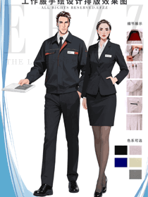 本套男女工作服以 “藏青传递沉稳专业,分版适配多元职业场景” 为核心设计理念。色彩选取藏青色为主调,赋予服装沉稳、可靠的视觉感受,契合商务洽谈、工业服务等多场景的专业属性;红棕色通过领口、口袋等细节撞色点缀,既打破藏青的沉闷感,又强化功能区域与品牌识别性。款式设计聚焦 “场景与性别适配”:男款采用工装夹克版型,立体剪裁保障作业动作自由度,多口袋布局便于工具收纳,满足实操类工作需求;女款选用西装套裙造型,修身剪裁与挺括面料塑造干练职业形象,适配商务接待、管理类场景。二者通过统一的藏青色系与标识牌设计,维持团队形象一致性,同时借助版型差异实现性别与场景的精准适配。面料选用耐磨抗皱的功能性材质(男款侧重耐用性,女款兼顾挺括垂坠感),让穿着者在不同职业场景中,既能展现统一专业的团队形象,又能获得契合工作性质的舒适穿着体验。