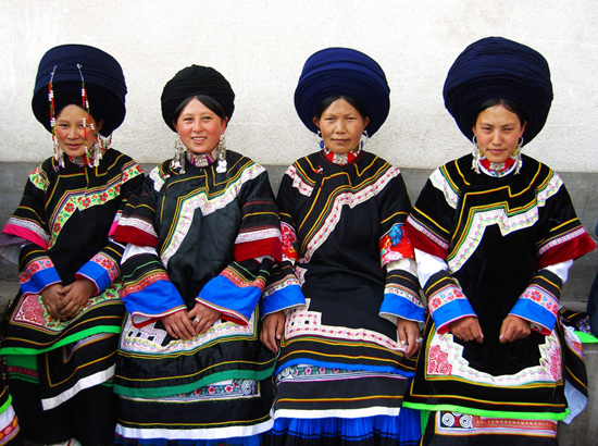 彝族姑娘很喜欢穿镶边衣,这是一种右衽宽长的上衣,衣服的衣袖和胸襟都绣有金、红、紫、绿等色花纹图案,衣领镶细银泡,这种服装也是彝族姑娘的一种护身符。