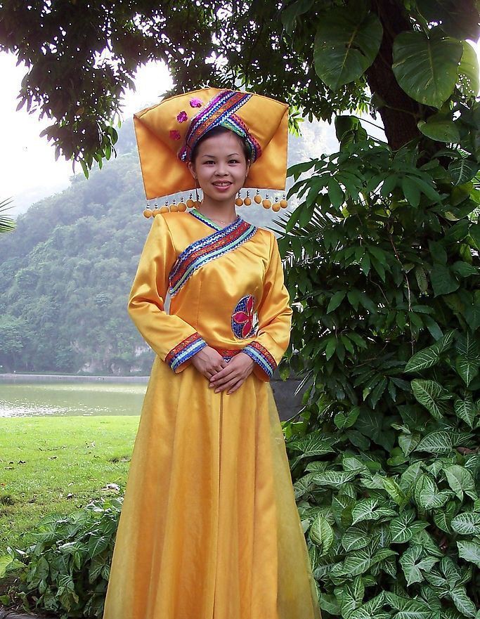 壮族妇女的服饰端庄得体,朴素大方。她们一般的服饰是一身蓝黑,裤脚稍宽,头上包着彩色印花或提花毛巾,腰间系着精致的围裙。上衣着藏青或深蓝色短领右衽偏襟上衣(有的在颈口、袖口、襟底均绣有彩色花边),分为对襟和偏襟两种,有无领和有领之别。有一暗兜藏于腹前襟内,随襟边缝置数对布结纽扣。在边远山区,壮族妇女还穿着破胸对襟衣,无领,绣五色花纹,镶上阑干。下穿宽肥黑裤(也有的于裤脚沿口镶二道异色彩条),腰扎围裙,裤脚膝盖处镶上蓝、红、绿色的丝织和棉织阑干。劳动时穿草鞋,并戴垫肩。在赶圩、歌场或节日穿绣花鞋。壮族妇女普遍喜好戴耳环、手镯和项圈。服装花色和佩戴的小饰物,各地略有不同。上衣的长短有两个流派,大多数地区是短及腰的,少数地区上衣长及膝。
