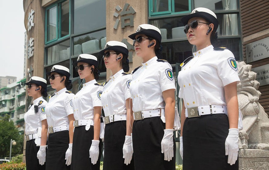 杭州武林广场上出现一批“黑超”遮面,一袭白衣,英姿飒爽的小姐姐。这11名酷劲十足的美女,隶属于杭州市下城区平安巡防支队,是新成立的“女子平安巡防中队”队员。队里共有11个女生,最大的25岁,最小的21岁,大多都是95后。她们平均身高1米7,个个高颜值,会英文,懂急救。如果没有特别任务,每天早上10点,这支“娘子军”会准时出现在杭州市中心。每天,她们会从武林广场出发,沿着武林商圈、西湖文化广场等区域开始巡逻。主要职责是协助公安机关维护治安,为市民、游客提供咨询服务,对不文明事件进行劝导等等。图为“女子平安巡防中队”队员工作中。图为“女子平安巡防中队”队员现身街头准备开始巡逻。由于大部分的时间都在室外工作她们的肤色出现了黑白“分界线”。图为“女子平安巡防中队”队员的每日必须品。图为“女子平安巡防中队”在吃工作餐。本文由EFZZ制服设计网转载。